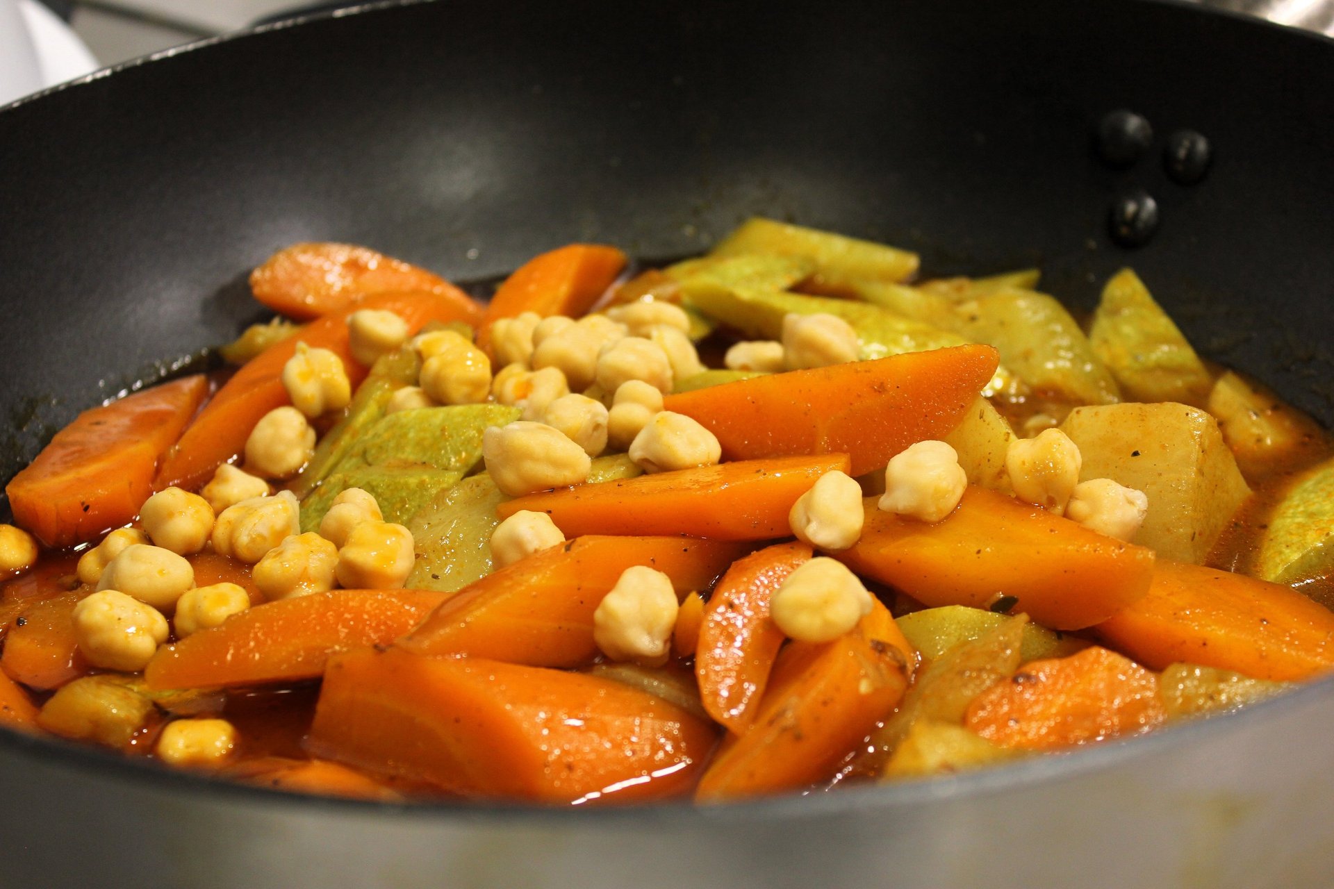 Semoule, carottes, courgettes, pois chiches, navets, bouillon aux épices.